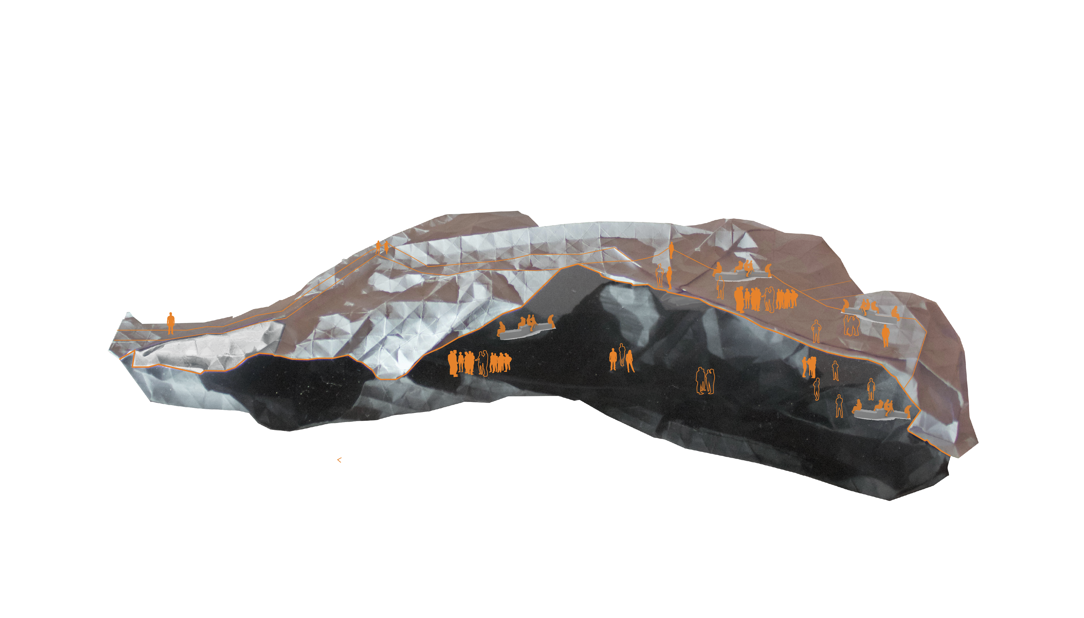 The Vein, a museum to accompany the Sagrada Familia in Barcelona, uses Antoni Gaudi’s original master plan of the surrounding blocks both to balance the monumentality of the Sagrada Familia and to connect with the green spaces of Barcelona. Our proposal takes the idea of his diagonal to divide our site into two halves, the above ground and underground. Thinking of the division like a vein, the rest of the site uses the logic of a leaf’s circulation to develop its spaces. The programming and structure of the museum further follows these two halves.